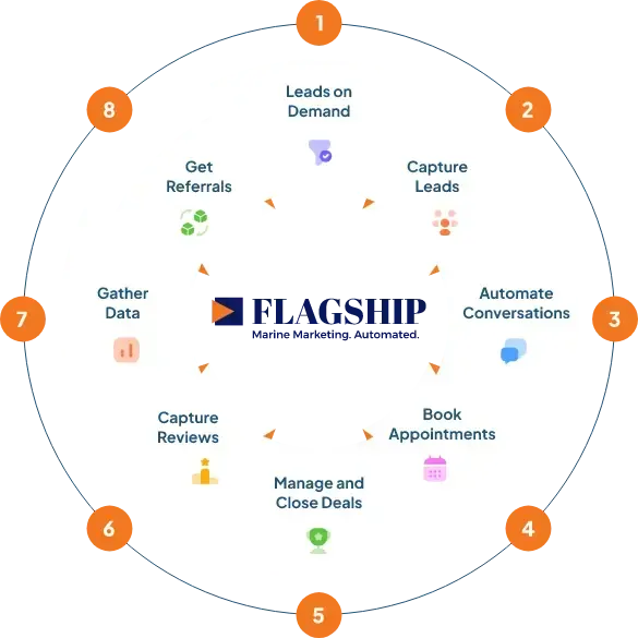 Because the marine industry is so competitive, you need a specialized solution that helps maximize every marketing dollar and turn prospects into loyal customers. Our Flagship Marine Marketing System is designed exclusively for boat dealers, marinas, and marine businesses—driving more leads, booking more appointments, and automating customer outreach.